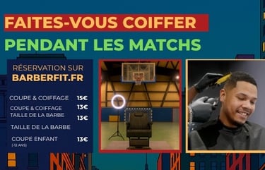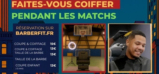 Cette année, viens vivre une expérience unique : te faire un dégradé, un taper ou une coupe clean en plein match, juste au bord du parquet, pour seulement 15 €. Tu profites du profites du spectacle et tu ressors frais.